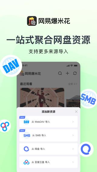 网易爆米花还支持阿里云、百度网盘等多种网络磁盘资源,丰富的播放功能和便捷的操作,让用户更轻松地享受视听体验和观影乐趣。
