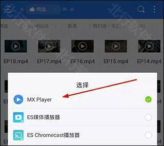 3、点击新建好的百度网盘,进入选择要播放的视频,选择MX播放器的选项。