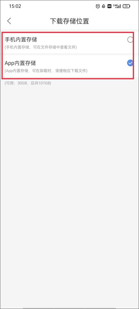 3、软件默认的存储位置是app内置存储空间,如果想将下载好的视频资源存储到手机内存中,就可以切换成第一个选项:手机内置存储。