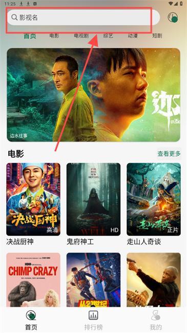 2、在首页搜索框处输入想看的影片名称点击搜索