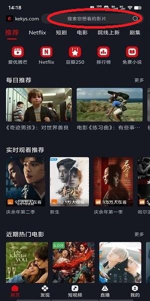 2、在软件首页界面查找或是在搜索栏搜索想看的影片。