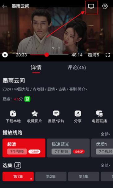 2、挑选自己想要观看的剧集,在右上角打开投屏,等待搜索设备。
