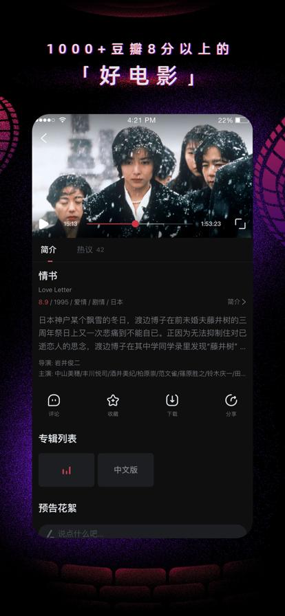 下载功能:用户可以下载自己喜欢的电影作品,在没有互联网的情况下观看。