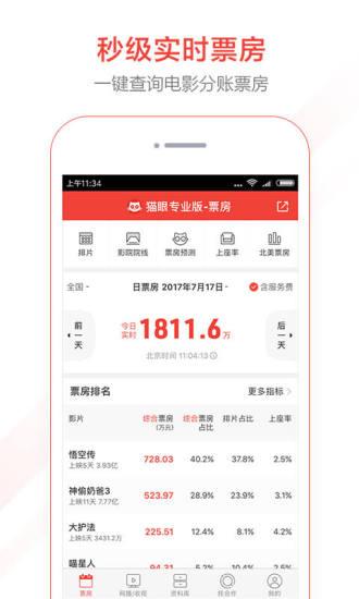 猫眼专业版是给专业电影人设计的手机影讯以及票房统计工具,它拥有实时的票房统计,大盘排片以及经营数据分析,让你精准的知道电影的排片,上座率,以及影片受众分析。