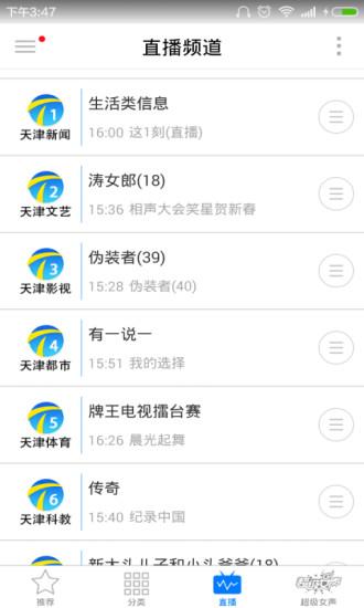 App中包含天津电视台11路直播频道,吉林10路直播频道,天津广播收音机,且支持48小时节目回看、直播节目预定、点播视频资源搜索、视频分享等功能。