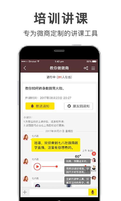 七八社,一个让网红更平民的直播平台,七八社是一个专为微商团队服务的APP,有效地解决微商团队的管理、培训、沟通等问题。提高成员活跃度,打造百万铁军团队。