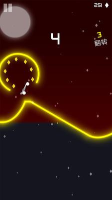 3、当摩托车倒转,仰面停滞时即为翻车,游戏失败。根据赛道轨迹控制小车跳跃翻转,以获取更多金币。