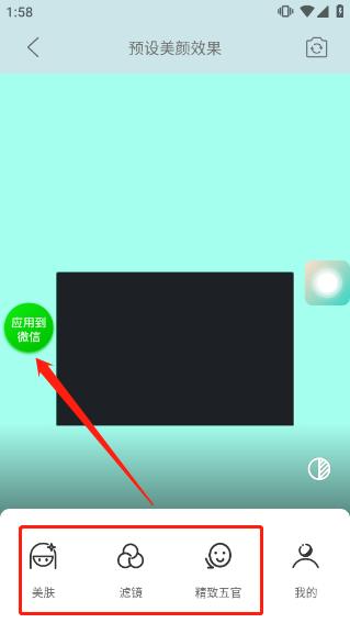 4、在其中,我们可选择各种类型的特效、滤镜、美肤等各种美颜效果,设置完成后需要点击应用到微信。