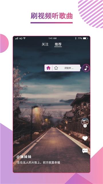 短视频听歌识曲app是一款强大的听歌的识曲应用。现如今短视频在我们的生活中非常的流行,往往短视频都会有非常好听的配乐内容,可以一下子我们又不能知道它的背景音乐,使用这款应用就可以为您快速的识别音乐的曲目哦。一款音乐的听歌识曲应用。刷短视频就能快速识别出歌曲,简单易操作,很直接的搜索方式,支持刷视频,看电影,听电台等情况,随时发现你喜欢的音乐。