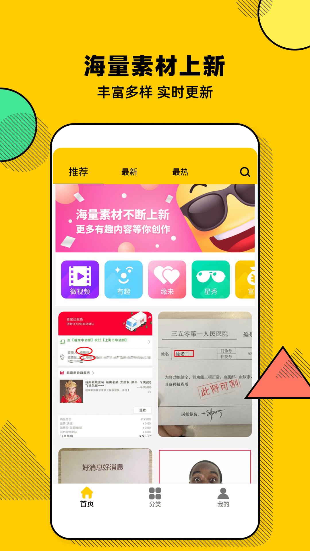 恶搞类、炫富类、证书类等等十余个热门分类素材等你来玩儿。