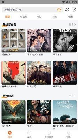 1.主页是最近流行的影视推荐,顶部是搜索框、播放记录和下载记录