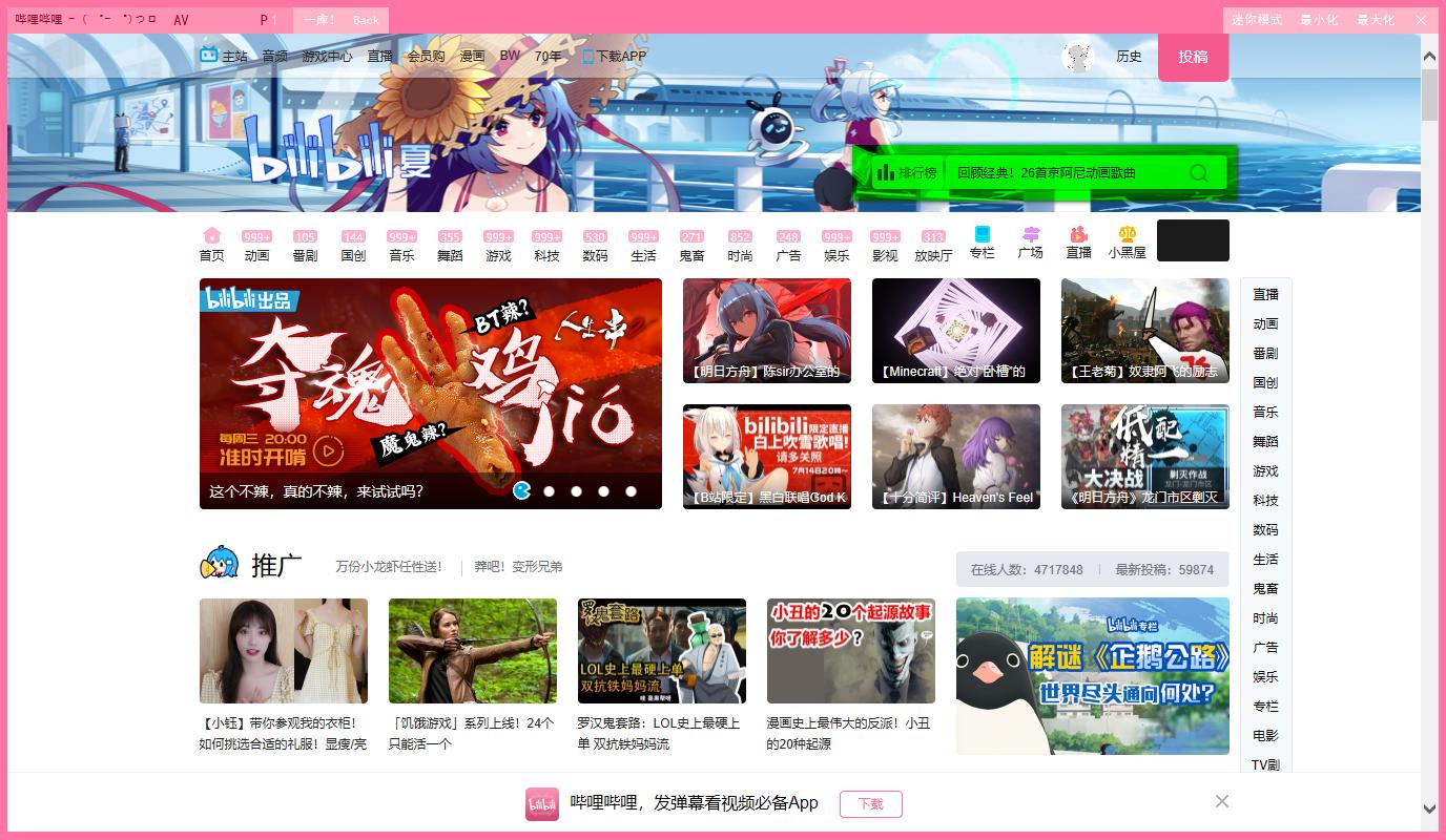 bilibili电脑版网页版是国内知名的弹幕视频分享站。客户端专注于ACG相关内容的在线视频分享。它经常被动漫迷戏称为哔哩哔哩哔哩。除了处理和分享,BiliBili上也有很多相同的人创作的作品和原创视频。目前有粉丝剧、动漫、游戏、娱乐、电影、电视剧、音乐、科技、鬼畜、舞蹈等十个区。