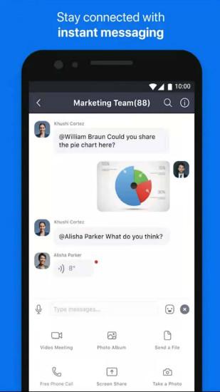 这个软件给用户工作带来了很大的便利,远程会议可以直接通过软件组织,这样每个员工都可以参加,该软件还支持群聊,可以发送图文信息或者和语音,让用户可以更方便的去使用,易于操作,喜欢的朋友快来下载体验吧!