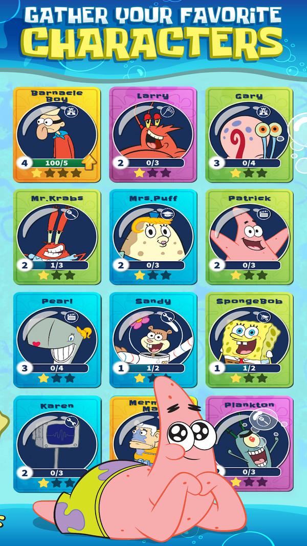 收集和升级海绵宝宝,派大星和章鱼哥人物卡来帮你!