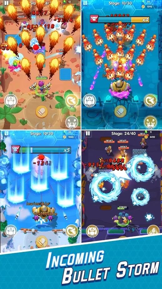 这款游戏的弹幕射击效果非常出色,往往能让你感受到满屏的特效的视觉感,游戏中的武器多样化,你可以选择远程武器或者进程武器,不断地前进你会拥有更多的金币来升级自己的战斗力。