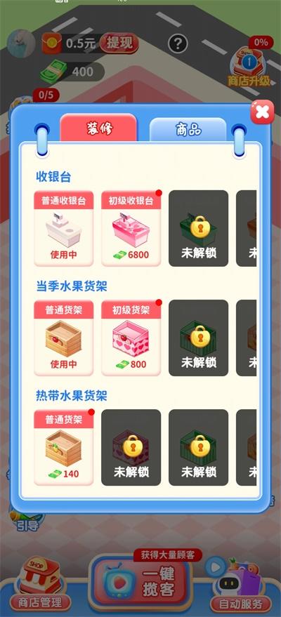 开心水果店游戏中,玩家将经营着一家水果超市,您需要源源不断的订购各种水果进行售卖,并提升水果店的规模,这样能够吸引更多的顾客前来,各种水果应用尽有,满足顾客的需求您才能有源源不断的收益;