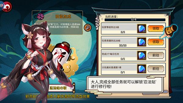完成指定的修行任务可以获得相应的钻石,把对应的修行任务全部完成的话,就能解锁对应的忍法帖给自己的队伍带来十分可观的BUFF加成哦。这些任务相信对各位大人来说一定都是小菜一碟,不断完成新的任务,解锁更加强力的忍法帖吧。