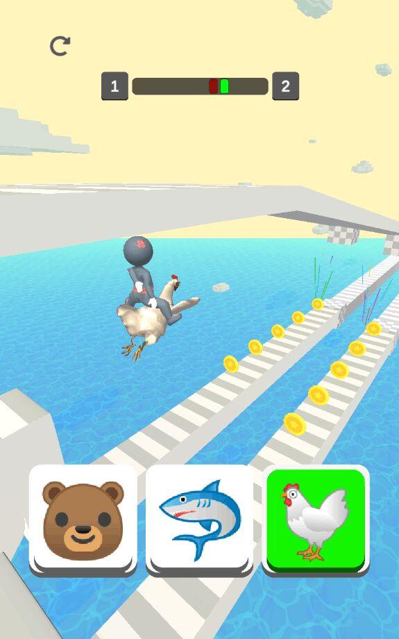 切换动物竞赛去广告版,游戏免广告,进入游戏后玩家可以看到你和你的对手,而下方有是三个动物按钮,玩家需要根据你前行的赛道来选择不同的动物,比如鲸鱼适合水里的赛道,鸡飞的快但是不能有障碍。