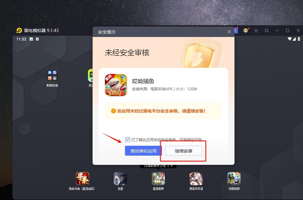 3、将哎呦捕鱼apk拖入到雷电模拟器,点击已了解此应用,再点击继续游戏即可进入游玩。