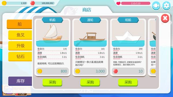 2、金币经济系统完善,通过售卖捕获的鱼类获取金币,用于购买新船、升级鱼叉、添置渔具或扩充血量,养成属性与即时操作相辅相成。