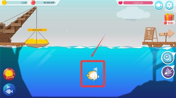 2、然后点击开始,游戏内如图,我们需要在合适的时机点击屏幕抛出钩子捕鱼。