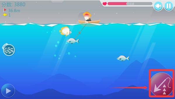 1、点击屏幕控制角色放下鱼钩,鱼钩下降到合适深度时再次点击即可钩起鱼类。不同鱼种对钩力与耐久的消耗不同,需要根据血量和时间灵活判断。
