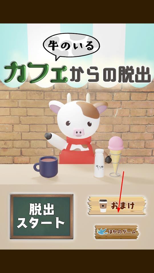 1、点击左侧黑板样式的脱出スタート按钮,开启从牛之咖啡馆的逃脱挑战,右侧おまけ按钮可查看额外内容。