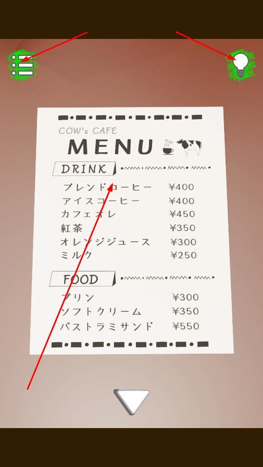 3、查看菜单界面COW's CAFE MENU,分析饮品如ブレンドコーヒー、食物如パストラミサンド信息,结合场景线索,破解谜题,推进逃脱进程。