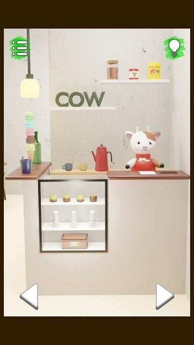 2、观察柜台、货架等区域,右上角灯泡图标为提示按钮,可点击获取解谜线索;留意牛角色及周围物品如饮品、冰淇淋、展示柜,寻找逃脱相关线索。