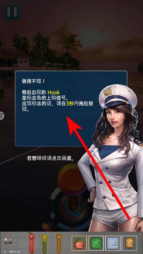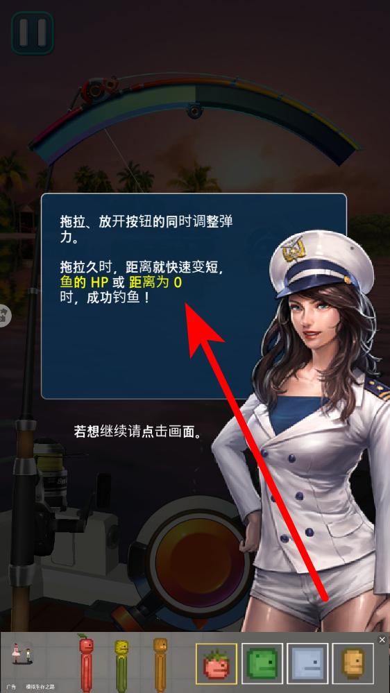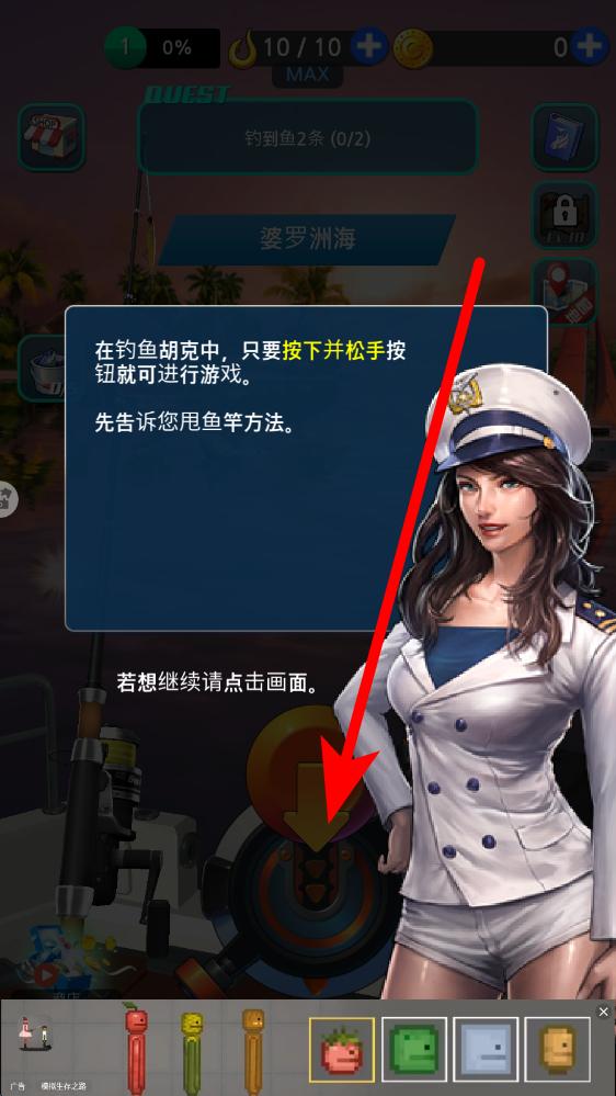 1、甩竿阶段游戏教学界面提示,按下并松手按钮可完成甩竿,这是捕鱼起始动作,需熟悉按键反馈,确保鱼竿精准甩出至目标水域。