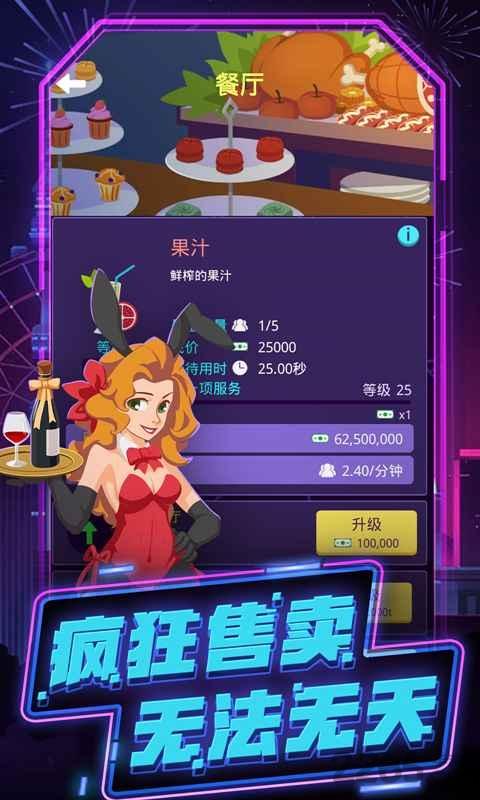 疯狂娱乐城游戏是一款模拟经营题材的经商游戏,玩家在游戏中需要经营一家娱乐城,从白手起家到一夜暴富,你将经历奇幻的人生,所有的一切要靠你自己的智慧来谋取,从而走上人生巅峰,感兴趣的朋友赶快来2265安卓网下载吧!